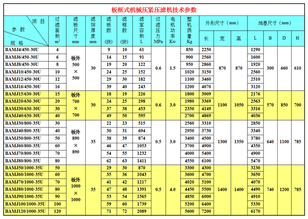 以下為板框式機(jī)械壓緊壓濾機(jī)技術(shù)參數(shù)